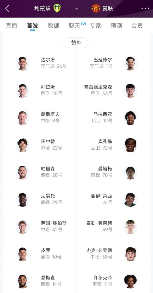 曼联首发方面,拉门斯镇守球门,后防线由达洛特、利桑德罗领衔,中场卡塞米罗搭档乌加特,锋线则由库尼亚和舍什科组成。利兹联方面,佩利把守大门,锋线组合勒温与奥卡福颇具威胁。